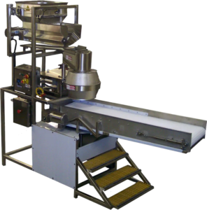 Our Singulator/Scale system makes precision batches a breeze. Product is first loaded into the singulator scale above. When it’s time to slice-in, the scale feeds exactly the correct weight into the slicer (we often use Urschel) and onto the high speed slice conveyor. The whole process takes seconds for optimal product freshness and reduced product sticking. A pair of fryers typically share one singulator system as the slice conveyor pivots between the fryers.